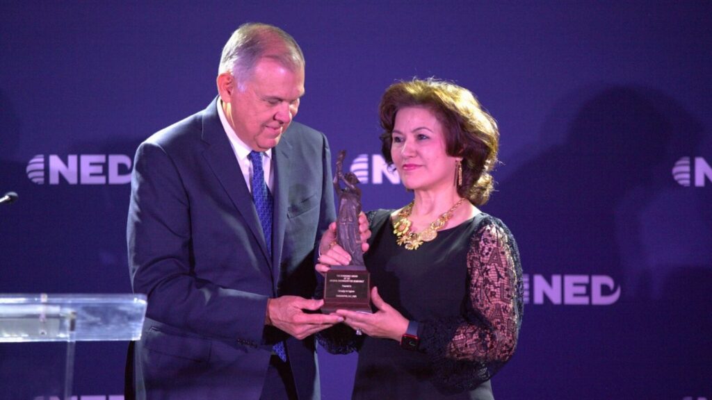 “我非常荣幸能够获得@NEDemocracy 2025年度民主奖,以表彰@CUyghurs 为维吾尔人民持续进行的倡导。这一奖项提醒我们:迫切需要直面维吾尔族所遭受的种族灭绝,并扩大他们在争取自由与正义斗争中的声音。我衷心感谢NED对维吾尔事业的支持与团结,也感谢CFU董事会和员工的无私奉献,让我们的工作得以实现;感谢我挚爱的家人和朋友,他们的力量与鼓励支撑着我每天前行。我们的使命尚未完成,我们将坚定不移地继续抗争,反对正在进行的维吾尔种族灭绝,捍卫人权与尊严的普世价值。”